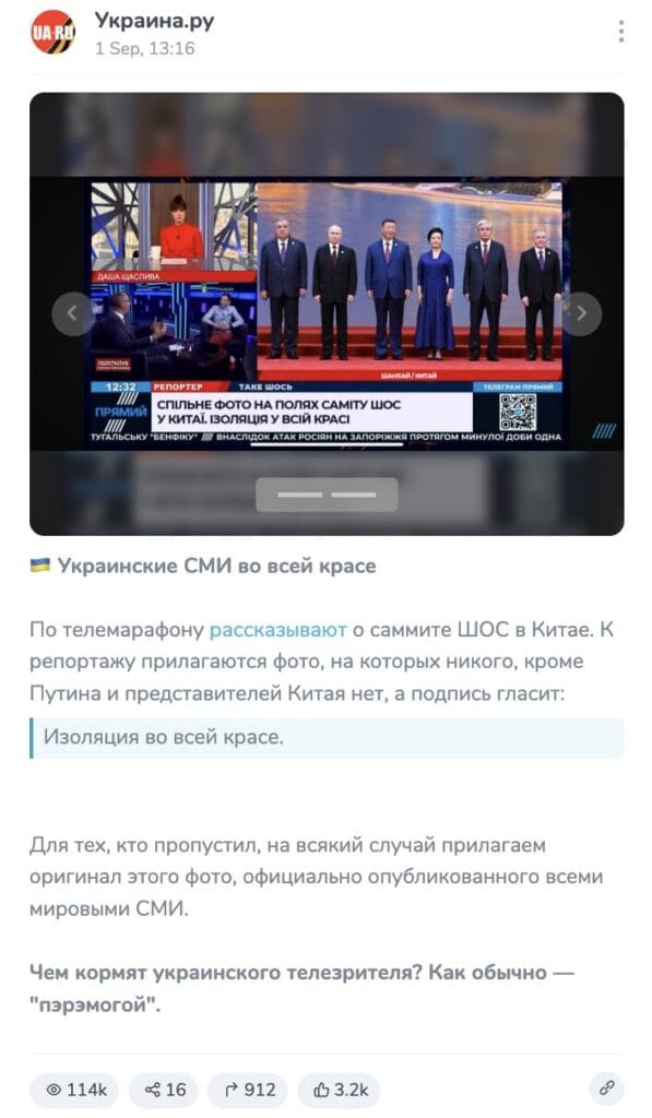 Posts accusing Ukrainian television journalists of alleged fraud went viral on September 1. Telegram channels posted two photographs: a screenshot of a certain broadcast showing a cropped photograph of Russian President Vladimir Putin, Chinese leader Xi Jinping with his wife and the presidents of Kazakhstan, Tajikistan and Uzbekistan with the caption “Joint photo on the sidelines of the SCO summit in China. Isolation at its finest,” and a real general shot of the leaders who arrived at the summit, where about 40 people sat around Putin.
