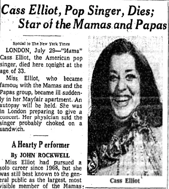 The day after Cass Elliot's death, many newspapers published the same details of the tragic incident: everyone referred to the singer's doctor, who said that she had choked on a sandwich while eating it in bed in front of the TV.