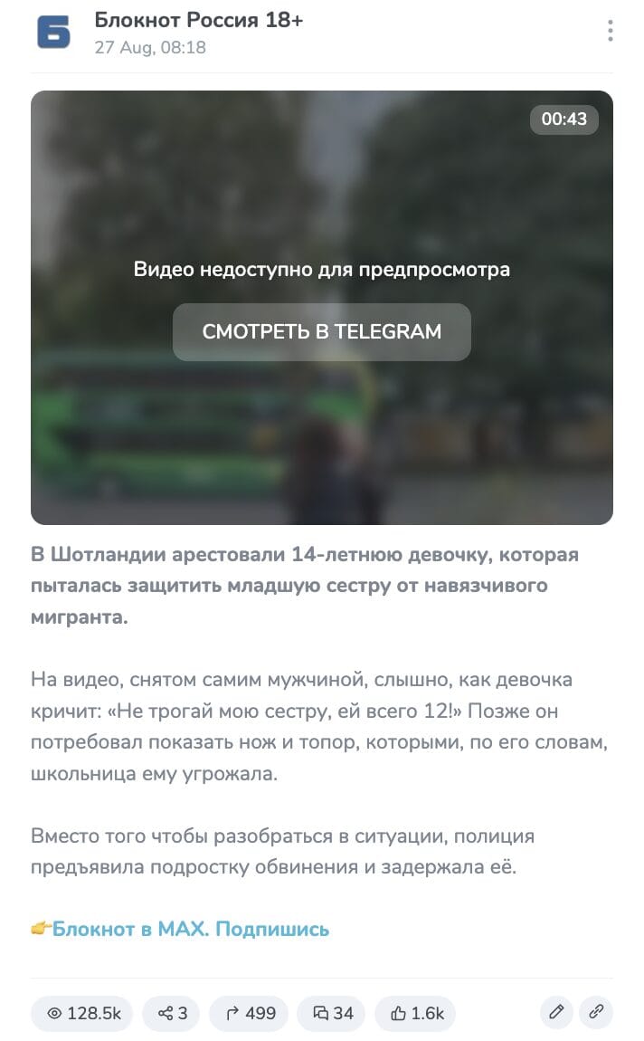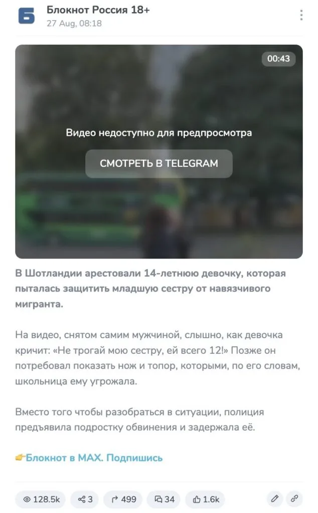 A video of a girl threatening a man with a knife and an ax began circulating on August 25. Internet users claim that this is how a 14-year-old resident of Scotland tried to protect herself and her younger sister, shouting at the same time: “Don’t touch my sister, she’s only 12!” “In Scotland, a young warrior girl fought back against migrants. The girl was of course arrested. And those who pestered her were released,” the Telegram channel reported.Sanya in Florida"(495,000 views at the time of writing this analysis).