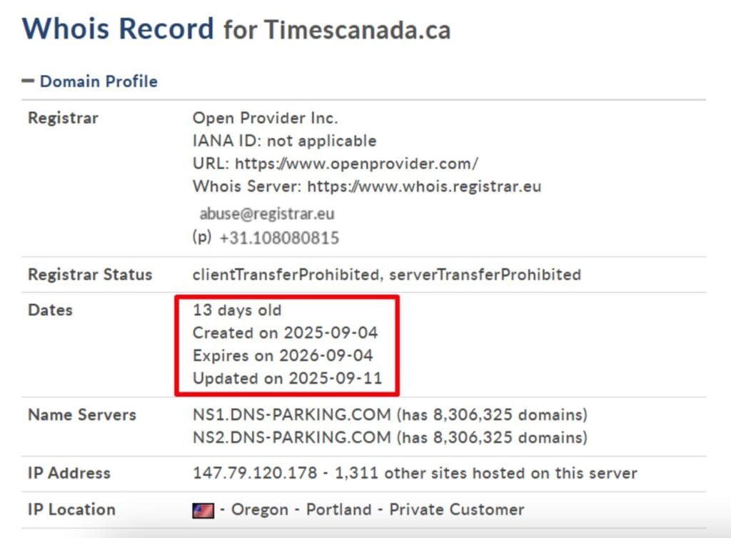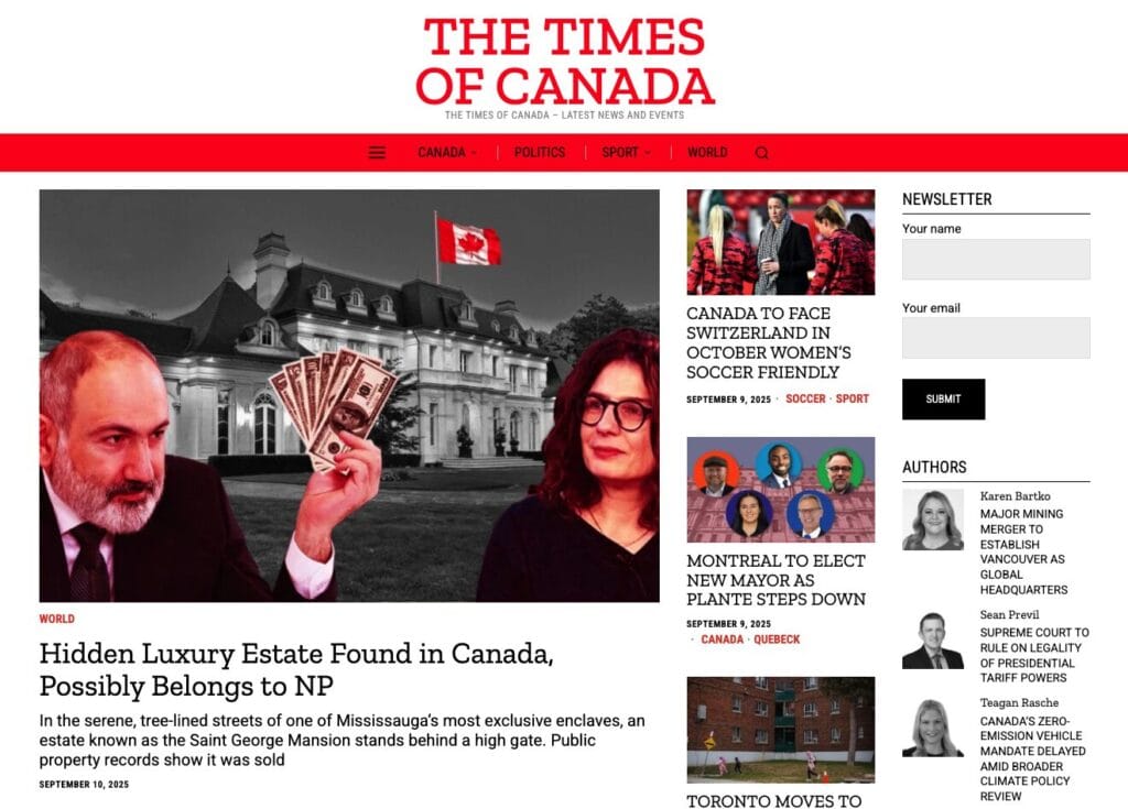 The website on which the investigation into the deal was published is much more suspicious. At first glance, it resembles the website of The Times of Canada, based in 2010 - the name, design and color scheme are the same. However, the domain of this media is thetimesofcanada.com, while the news about Pashinyan appeared on timescanada.ca. According to the Whois service, this address was registered on September 4, 2025, just a few days before the publication of the investigation.