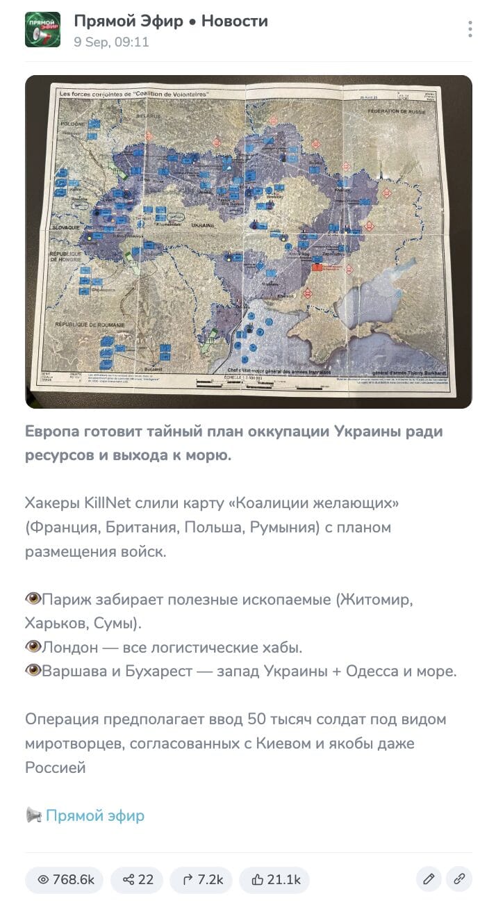The photo went viral on September 8. It shows a map of Ukraine, which highlights mineral deposits, logistics hubs and ports, and also depicts the expected deployment of foreign troops in the country. The Telegram channels that published the map noted that in exchange for the deployment of its military, France will receive access to Ukrainian minerals, Great Britain - to logistics hubs, Poland will occupy territories in the west of the country, and Romania - in the southwest, including ports in the Odessa region. The media that shared it sarcastically noted that the “Coalition of the Willing” is actually the “Coalition of the Push-Ups.”