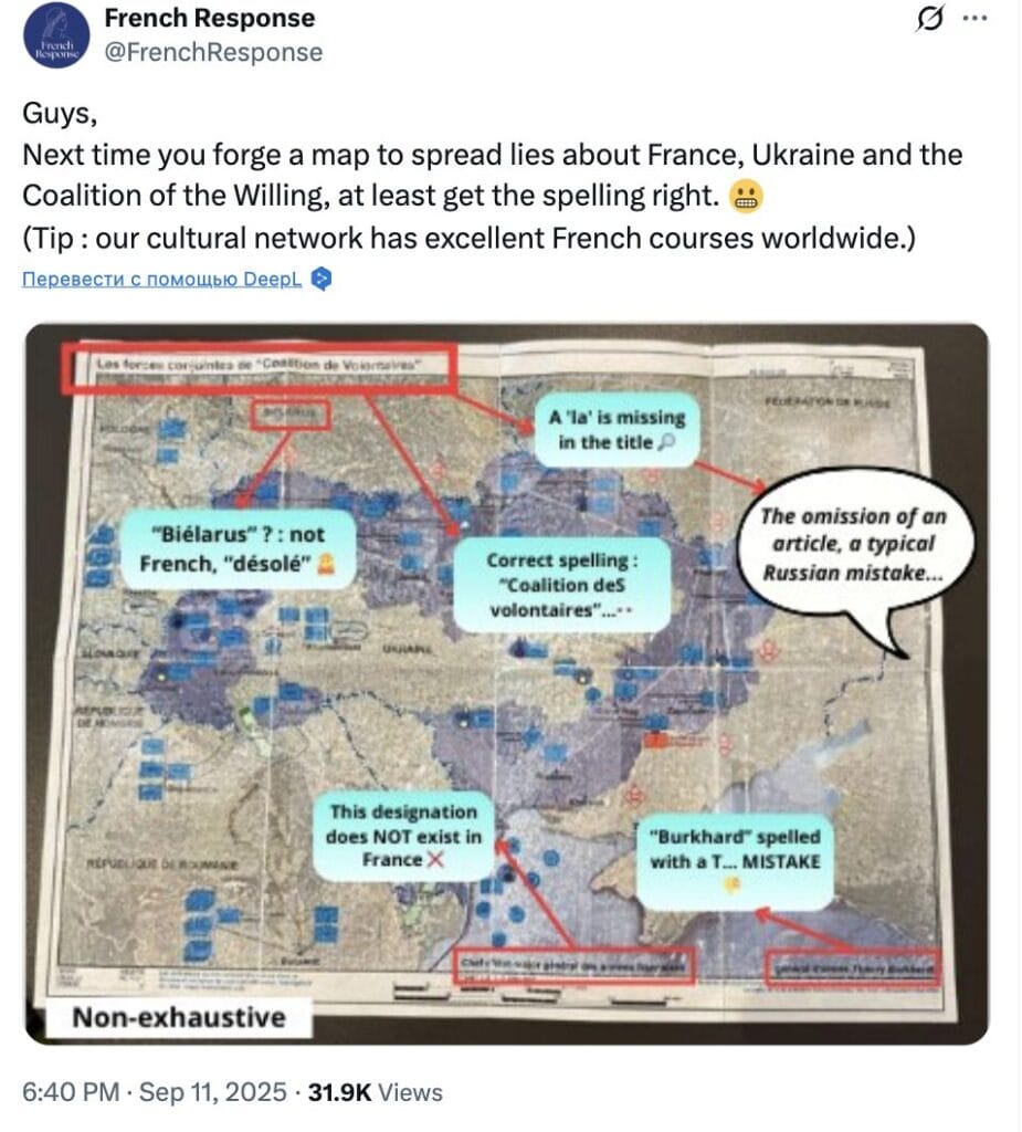 Then the picture was actively distributed on social networks as Russian, and on English language. September 11th to one of these viral publications in X replied @FrenchResponse account. This is the page of the French Ministry of Europe and Foreign Affairs, created to combat online disinformation. The department called the card a fake, pointing out a large number of grammatical errors, including those typical for native Russian speakers. It is also emphasized that the position of Chef c'état-major général des armées francaises (Chief of the General Staff of the French Armies) mentioned in the document does not exist.
