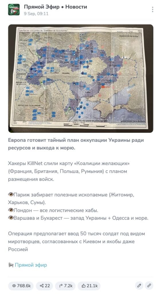 Thus, the only evidence of the plan to divide Ukraine between the four countries from the “Coalition of the Willing” is a photograph of the map, first published in the pro-Kremlin Telegram channel. The text on the map contains a large number of errors atypical for such a document, and representatives of the French authorities called the photo a fake.