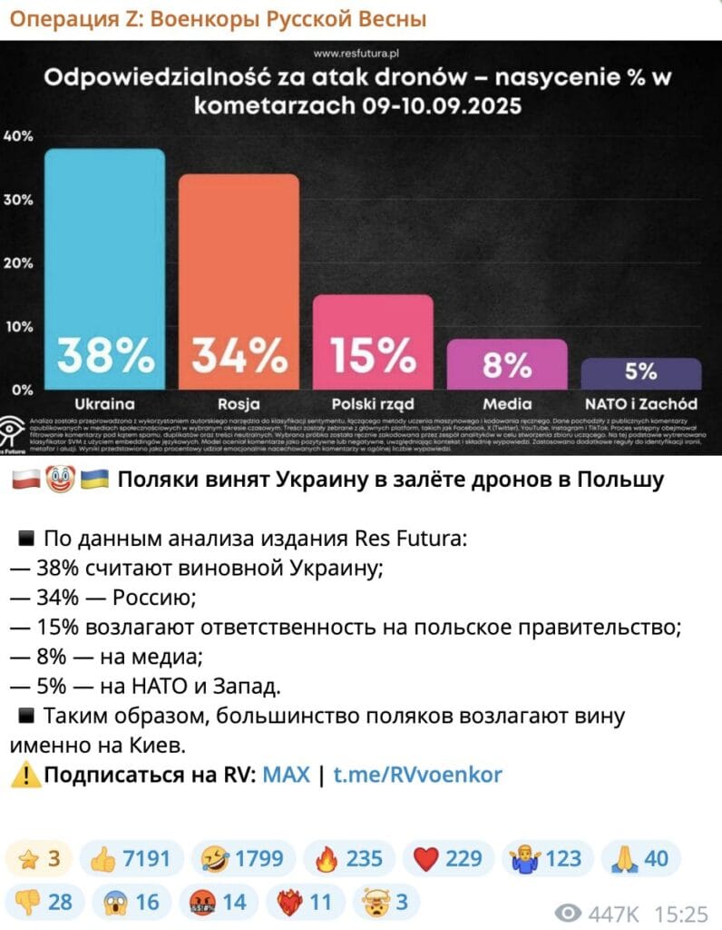 On the afternoon of September 10, Russian-language Telegram channels reported that, according to the Res Futura Foundation, the majority of Poles hold Ukraine responsible for the drone invasion of Poland. The posts were accompanied by a graph with text in Polish: “Responsibility for drone attacks - percentage distribution in comments (September 9–10, 2025). Ukraine - 38%; Russia - 34%; Polish government - 15%; Media - 8%; NATO and the West - 5%." This graph was published by such Telegram channels as “Operation Z: military correspondents of the Russian spring"(447,000 views at the time of writing this analysis), "The world of Mikhail Onufrienko"(197,000), "Uncle Slava"(171,000), "Russia now • news" (148,000) and "Putin on Telegram"(143,000).
