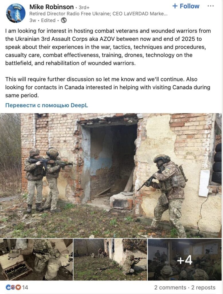 Screenshot on the basis of which the conclusion was made about Mike Robinson’s cooperation with Azov, real. On September 1, Robinson wrote on LinkedIn that he was looking for people who, by the end of 2025, are ready to provide platforms for public meetings with the participation of Azov veterans in the United States and Canada. In April 2024, Robinson spoke about friends, serving in this unit, as well as about its problems with ammunition and equipment. Not a single publication mentions cooperation with Azov or participation in training snipers for the Ukrainian army.