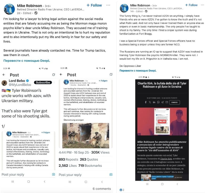 On September 12, two days after Kirk was killed, Mike Robinson posted on LinkedIn there is a post about this incident, in which he recalls his service in special forces and discusses the weapon used by the criminal. The publication is accompanied by photographs of the shooter, while the author comments on his actions as an outsider.