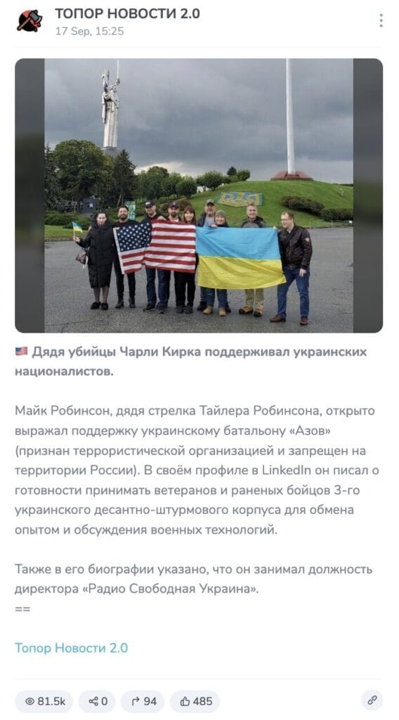 Reports that a close relative of Tyler Robinson, detained on suspicion of murdering Charlie Kirk, collaborated with the Ukrainian Azov Brigade began spreading on September 17. As proof, Internet users, followed by media and Telegram channels, posted a photograph in which a group of people stands with the flags of the United States and Ukraine next to the Kyiv “Motherland” monument, as well as a screenshot of a post where “Azov” is mentioned. It is alleged that Mike Robinson, who published it, is depicted in the photograph and is the uncle of the man who killed Kirk.