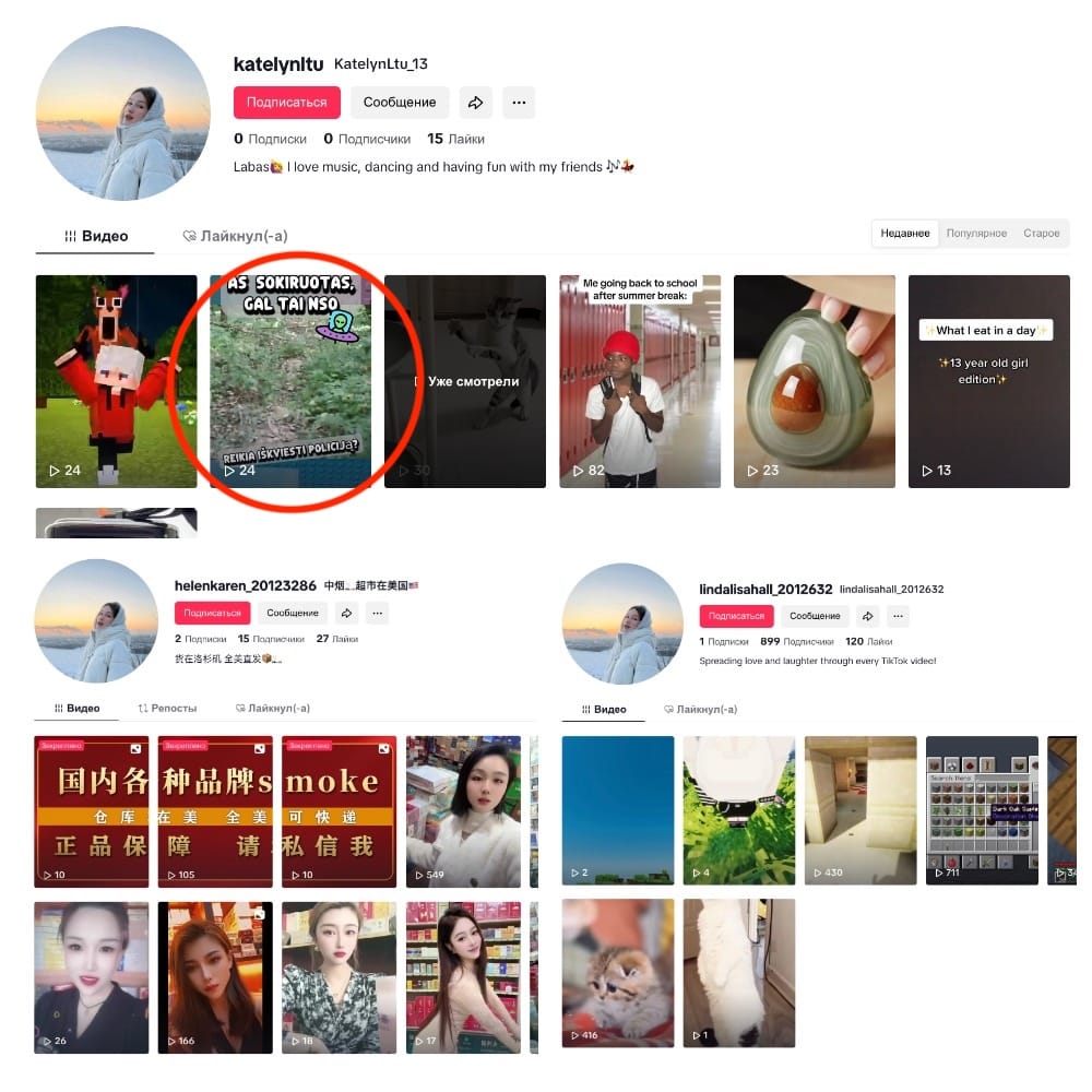 In the upper left corner of the video is the TikTok logo and the username of the user who posted video, - @katelynltu. He published this video on September 4, and also posted six more videos that collected several dozen views and were not related to Lithuania. The blogger has no subscriptions or subscribers. The profile description states: “I love music, dancing and having fun with friends.” Most of the videos published by this account were previously distributed on the Internet - for example, AI videos with avocado appeared at least two months ago, other rollers Also became viral long before publication on the @katelynltu page. Moreover, the same profile photo is used in at least two others TikTok accounts.
