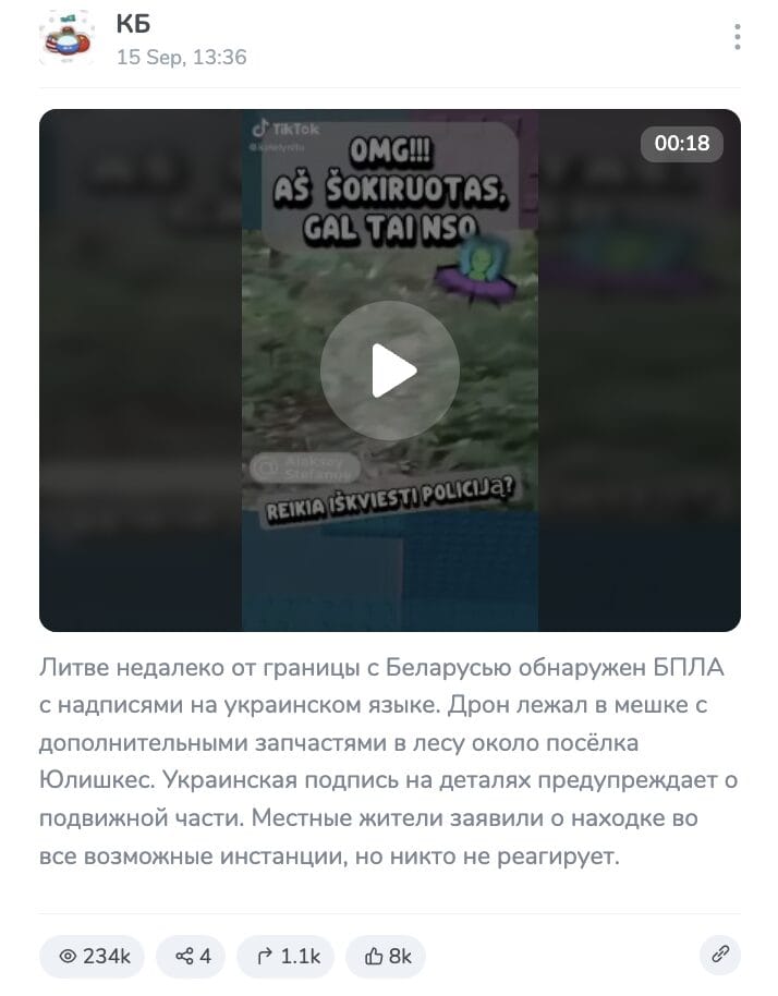 Thus, the only evidence of a drone found in a Lithuanian forest with inscriptions in Ukrainian is a video that appeared on an almost empty TikTok blog that had nothing to do with Lithuania, and 11 days later it was distributed by a pro-Kremlin journalist. However, it is not possible to determine exactly where the video was filmed.