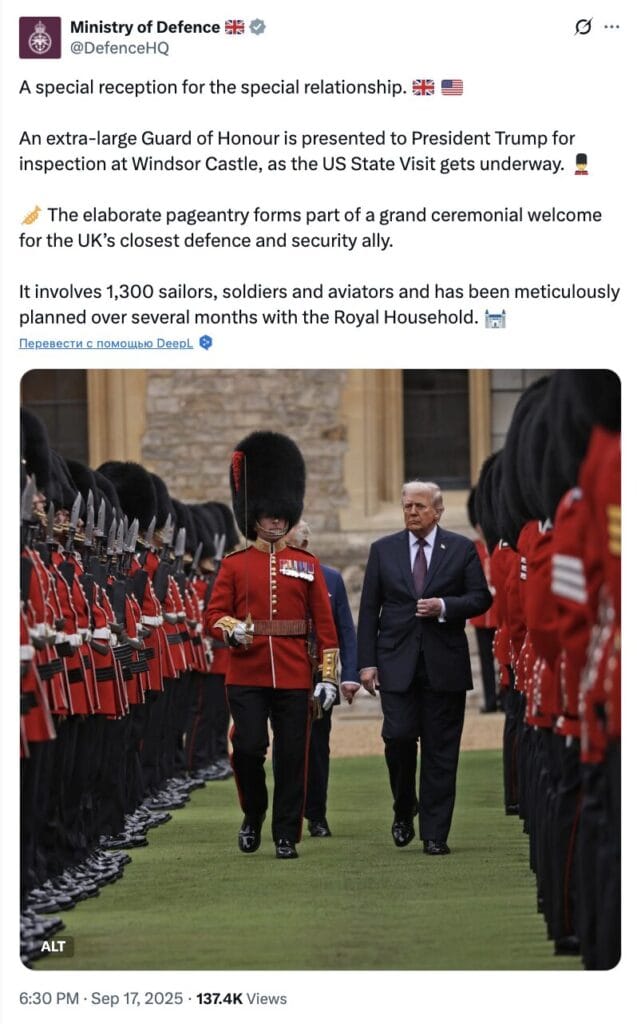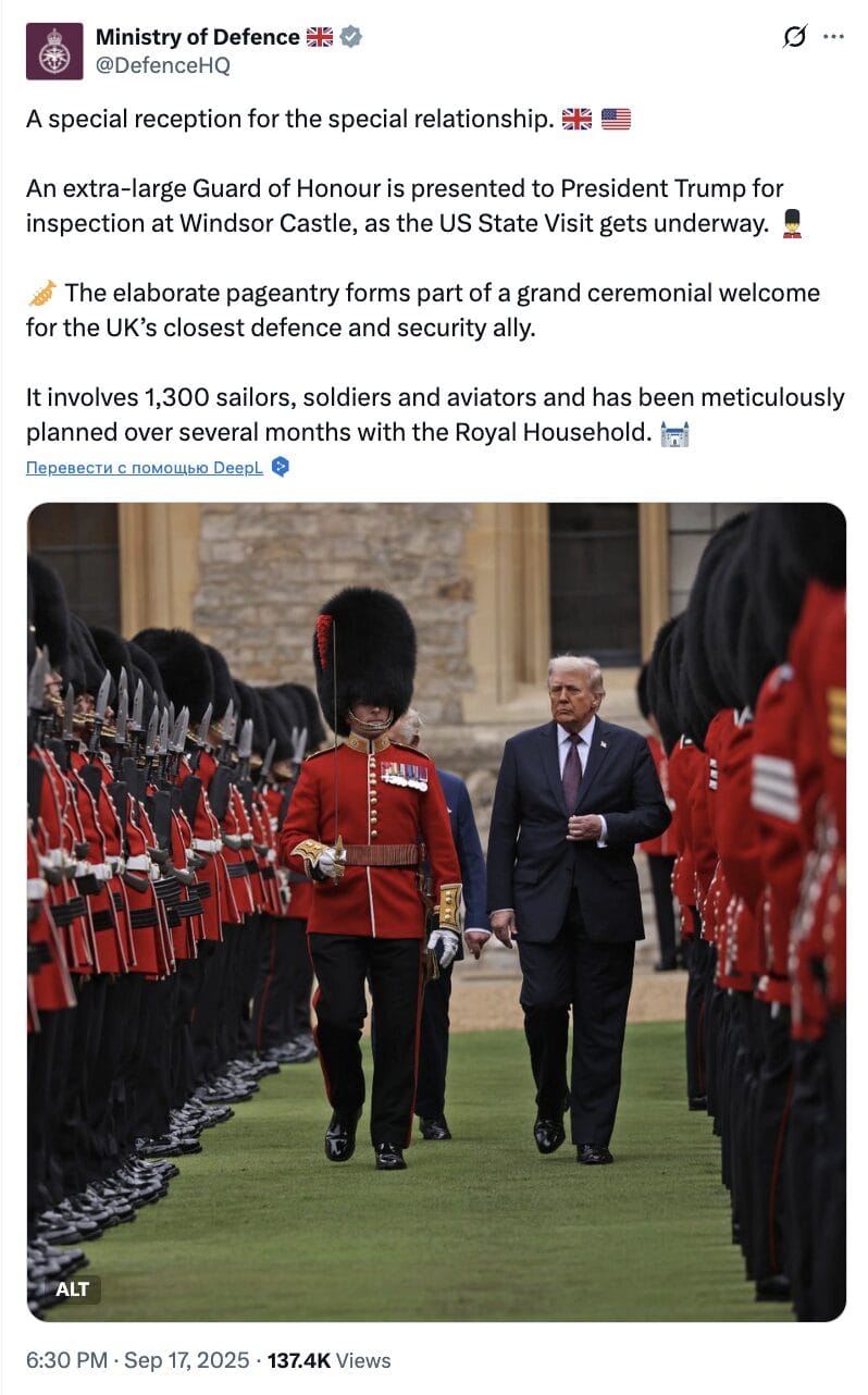 On September 17, media and Telegram channels reported that Donald Trump violated diplomatic protocol during his state visit to the UK: when the US President inspected the formation of the guards, he walked noticeably ahead of King Charles III. This behavior is supposedly considered offensive, since guests of the British monarch are required to walk next to him.