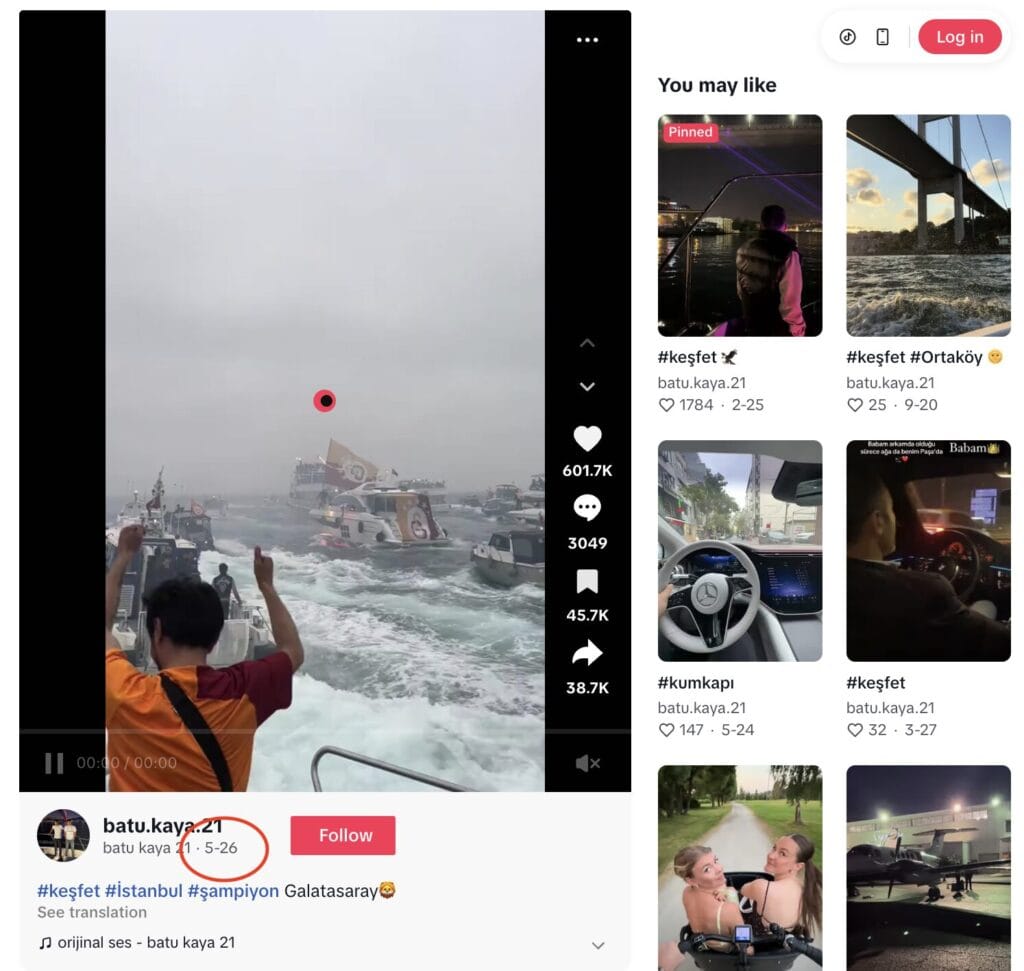 On its website, the Sumud flotilla conducts direct broadcasts from ships, but nothing resembling the viral video could be found among them. But using a reverse image search on Google, “Verified” found a much earlier fast with a viral video. On May 26, 2025, a few months before the flotilla's departure, a TikTok user with the username @batu.kaya.21 posted an 11-second video with the caption “Galatasaray” and the Turkish hashtags “Istanbul” and “champion.”