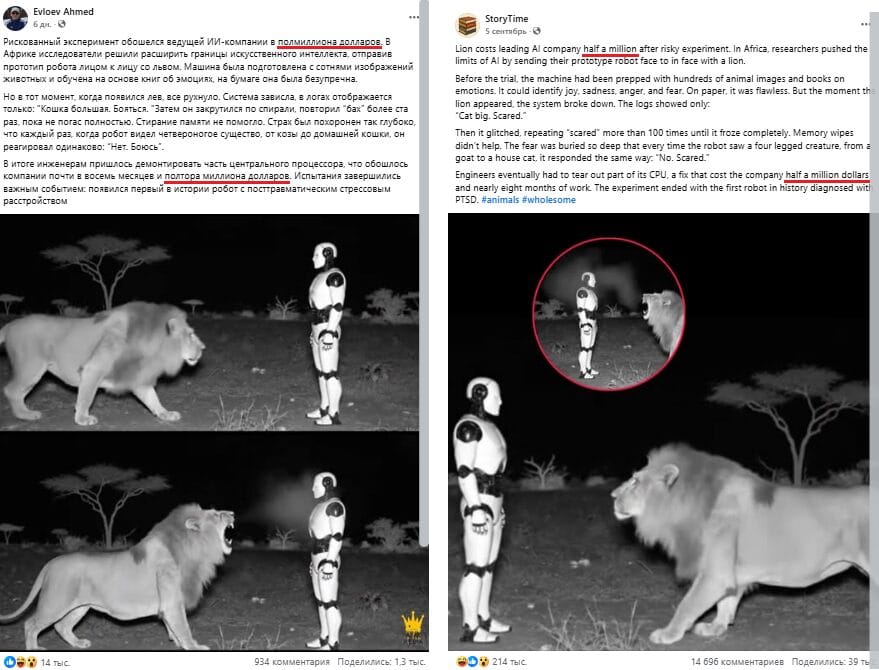 In RuNet, such posts gained the greatest popularity on Facebook*. For example, user Akhmed Evloev (14,000 likes and 1,300 shares at the time of writing this analysis) told the story this way: “A risky experiment cost a leading AI company $500,000. In Africa, researchers decided to push the boundaries of artificial intelligence by sending a robot prototype face-to-face with a lion. The machine was prepared with hundreds of pictures of animals and trained on books about emotions, and on paper it was flawless. But the moment the lion appeared, everything collapsed. The system froze, the logs only show: “The cat is big. Be afraid.” Then it began to spiral and repeat “bang” over a hundred times until it went out completely. Erasing the memory didn't help. The fear was buried so deep that every time the robot saw a four-legged creature, from a goat to a domestic cat, it responded the same way: “No. I'm afraid.” As a result, engineers had to dismantle part of the central processor, which cost the company almost eight months and $1.5 million. The tests ended with an important event: the first ever robot with post-traumatic stress disorder (PTSD).” Other users posted similar posts on this social network (examples here, here, here And here), and also communities, dedicated to pseudoscience. Stories about this experiment can be found on Telegram (here, here And here), Threads*, Instagram* And TikTok.