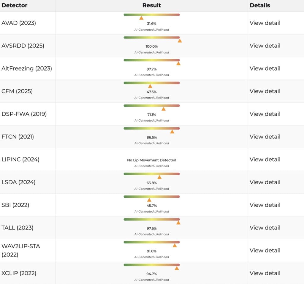 We analyzed the video using DeepFake-o-meter, a service for identifying AI content. Most detectors rated the probability of using neural networks to create this video as high and even close to one hundred percent.