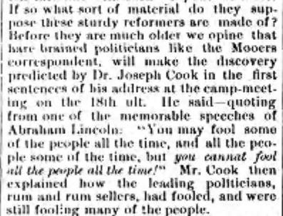Only a few days have passed, and the phrase in his speech repeated another New York state prohibitionist activist, William Grew, but without referring to Lincoln. The following year, this phrase, again with reference to the 16th President of the United States, was quoted more V two prohibitionist publications in different contexts. And since 1887, citation became popular and out of connection with the described topics. It should be noted that representatives Prohibition Party in the 1880s they were an influential political force - their candidates came third in the presidential elections, so the maxims expressed by the prohibitionists could well have gone among the people, especially if they were attributed to Lincoln himself.