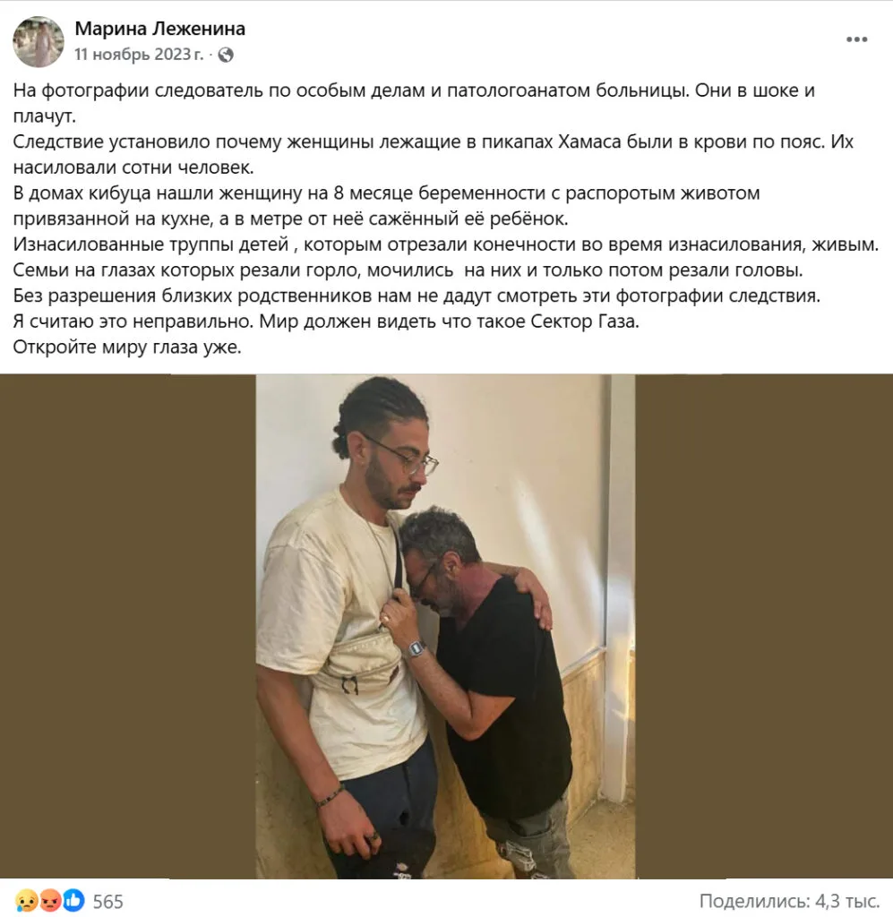 In October 2025, a photo of two men crying went viral on social media. It is alleged that this is how they responded to the results of the investigation into crimes committed by Hamas militants during the attack on Israel. We have verified the accuracy of such publications.