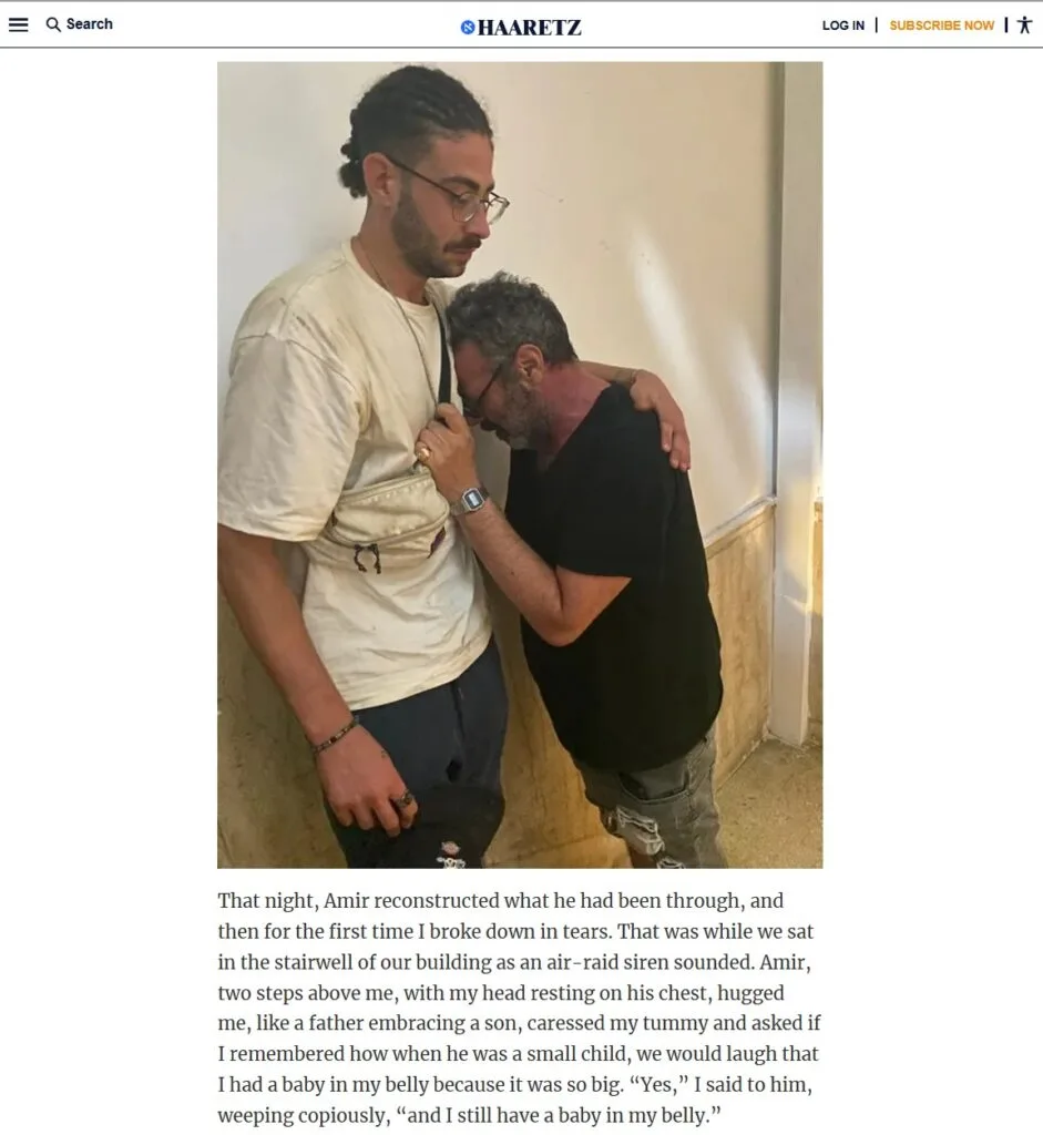 “That night Amir recalled what he had experienced, and that was the first time I cried. We were on the landing of our house and the air raid siren was blaring. Amir, standing two steps above me and pressing my head to his chest, hugged me like a father hugs his son, stroked my belly and asked if I remember how, when he was little, we joked that I had a child in my belly, that’s why my belly was so big.”