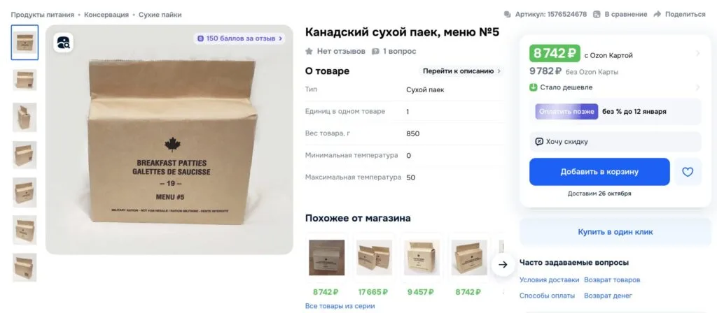 We also contacted Russian and Ukrainian sellers of foreign army rations. Of those who advertised the sale of Canadian IRPs on OLX, one person replied. He said that a friend gave him three of these IRPs, he ate one, and decided to sell the remaining two. As for Russian sellers, one of them, who offered Canadian dry rations for Avito, after our request, he removed the ad from sale, the seller Ozon did not respond to the message (although the product itself is still available for purchase), and a site representative suhpaytorg.ru reported: “NATO rations are not yet available and, most likely, will not be.”