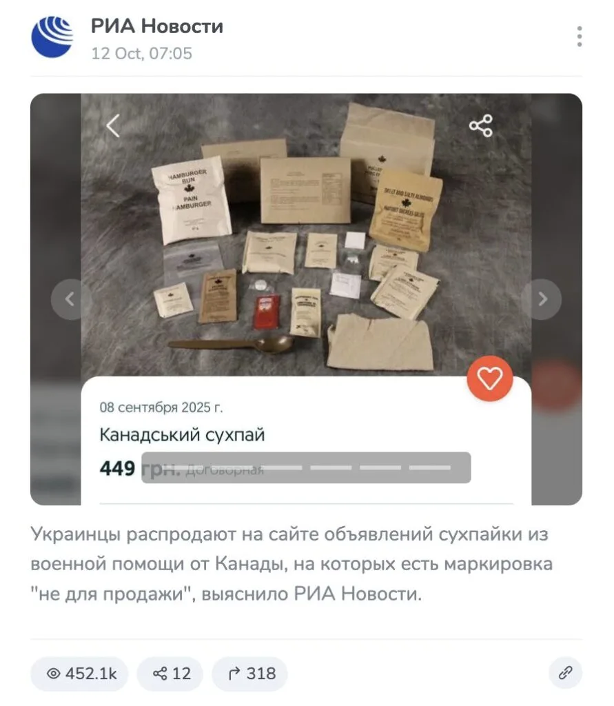 In mid-October 2025, reports appeared in Russian media that Ukrainians were allegedly illegally resell army individual food kits sent to the Ukrainian army from Canada. We have verified the accuracy of this information.
