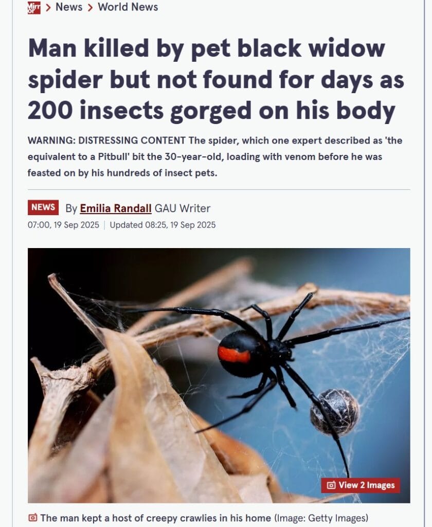 The British newspaper The Daily Mirror, which was cited by many Russian-language media, told about Vogel's death from a black widow bite on September 19, 2025. In general, Russian publications correctly recounted that article, although they ignored some details. For example, according to the tabloid, due to the abundance of terrariums, the apartment was “flooded with a strange green light,” and in the corner of the ceiling one tarantula made a nest the size of a swallow. In addition, in addition to spiders, a boa constrictor and several other snakes, poisonous South American frogs and a gecko named Helmut, Vogel's collection allegedly included several thousand termites, which are used to feed such exotic animals.