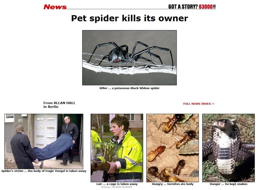 "Verified" found an archived copy notes that The Sun released February 27, 2004. It contains the same details and eyewitness accounts as later publications. The note also included a possible explanation for how the animals got to Vogel's body: during his lifetime, he allowed reptiles to move freely around the apartment, and spiders and termites crawled out of their tanks because the heating elements exploded and dislodged the metal covers. Moreover, The Sun even published several photographs, which, according to the tabloid, showed Vogel’s body and terrariums being taken out into the street. “An autopsy will be carried out in the next few days. However, the authorities believe that only [black widow] Bettina is responsible for Vogel’s death,” the author concluded.