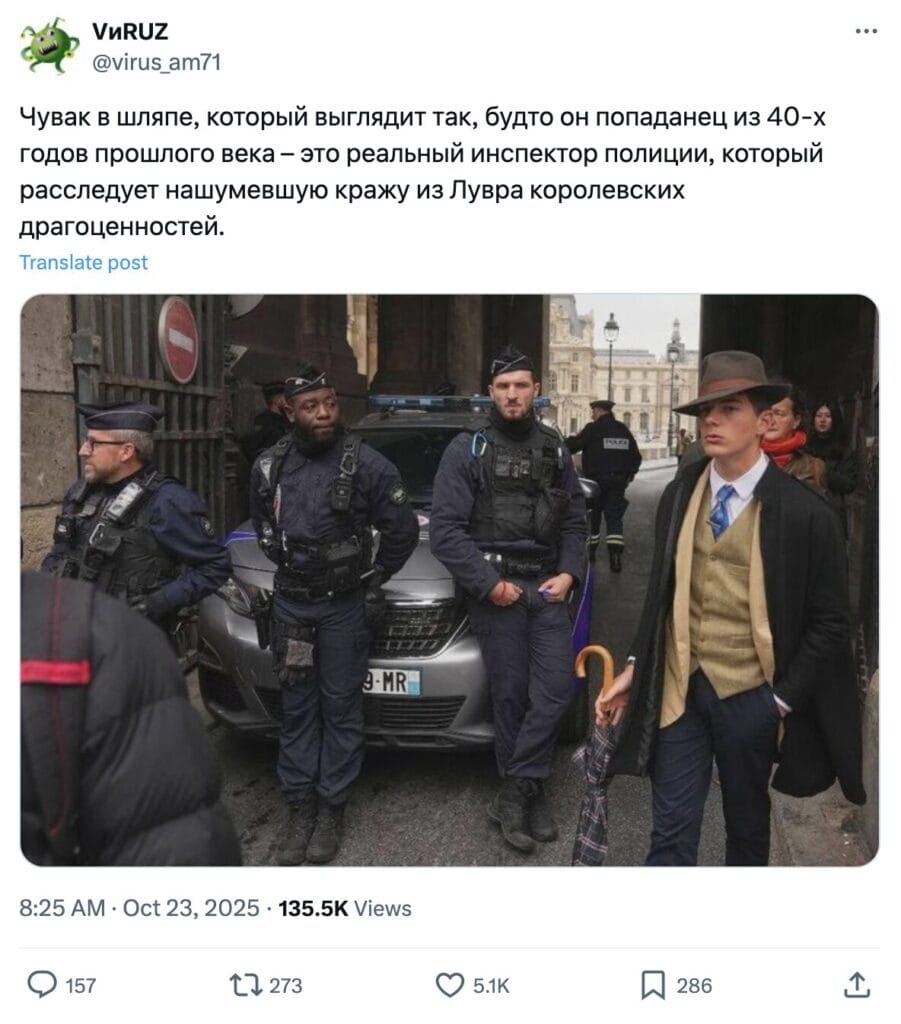 The photo shows a group of police officers in uniform. Standing next to them is a young man in a hat, dressed in 1940s fashion. “This is a real police inspector who is investigating the sensational theft of royal jewels from the Louvre,” says the caption to the photo in post user VIRUZ on social network X (135,000 views at the time of writing this analysis). The photo of the alleged police inspector was also discussed on Facebook (1, 2, 3, 4), and in Telegram the publication of the channel “The Goat Screamed” with this photo dialed 155,000 views.