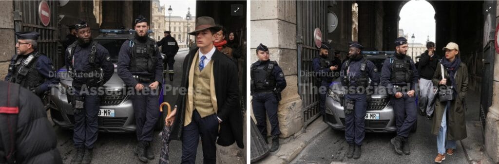 As for the viral photo, it was done Associated Press photographer Thibaut Camus. On the agency’s website, the photo is captioned: “Police block access to the Louvre after a robbery on Sunday, October 19, 2025, in Paris.” Although even with such a signature one might decide that the man in the hat is a policeman, there are more in the selection of photographs one, made by the same Camus from the same point and provided with the same description, but on it, next to law enforcement officers, a woman in a baseball cap and trench coat is depicted, behind whom (as well as behind the young man in the hat) a chain of people is visible. Perhaps these are museum visitors who come out from the area cordoned off after the robbery.