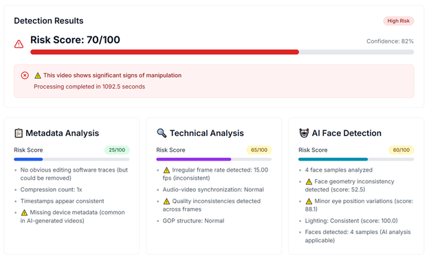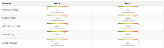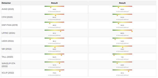 “Verified” analyzed the video using a service to identify AI content DeepFake-o-meter. Based on the results of the analysis of both fragments with the volunteer’s monologue and his dialogue with the guard, several video detectors rated the likelihood of using neural networks as high.