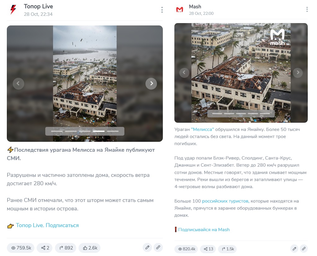 Also in the Russian-language segment of the Internet, a video allegedly filmed on board an airplane has spread, which was posted on the Telegram channel of the presenter of Channel One. Olesya Loseva (16,000 views) commented: “Look at what Hurricane Melissa looks like from above, moving towards Jamaica at a speed of 282 km/h. The footage is both fascinating and terrifying at the same time!” The same video was published by channels Mash (836,000 views), "RIA Novosti"(556,000, video later was replaced), AST-54 Black (88,000), "Release Kraken Z!"(63,000), "Kryminforum 🇿 🇴 🇻" (15,000), "Alexey Zheleznov"(14,000), etc. Similar posts also went viral on English, Spanish and other languages.
