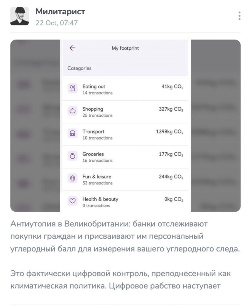 The fact that financial institutions in the United Kingdom, under the pretext of caring for the environment, began to monitor customer spending, wrote Russian-speaking informational portals, specialized resources about banking And technologies, social network users (“VKontakte", Threads, X, Facebook) and Telegram channels, including “ZeRada"(273,000 views at the time of writing this analysis), "Luka Ebkov"(182,000), "Militarist" (146,000), "Dmitry Vasilets"(106,000), etc. Many publications were accompanied by a screenshot of a banking application with calculations of the carbon footprint that the client left with his purchases. The authors of the posts express fears that in this way the “globalists” are establishing digital control over the population: supposedly, a spending limit will soon be introduced, determined by the carbon footprint and independent of the amount of money in the account.