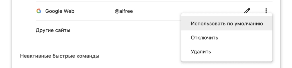 - fill in three fields in the drop-down window - for example, Google Web in the “Name” field, @aifree in the “Keyword” field and the address {google:baseURL}search?q=%s&udm=14 in the URL field;