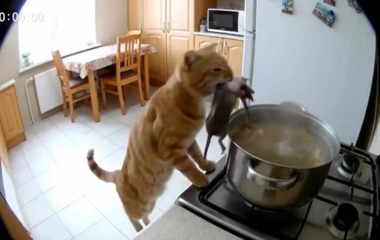 Is this video of a cat throwing a mouse into a pot of soup real?